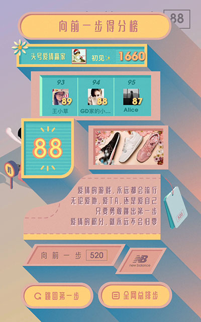 新百伦携手W,以“向前一步520”为主题,以火爆朋友圈的“跳一跳”小游戏为核心,打造了这支有态度的作品。在视觉设计上参照了纪念碑谷的小清新唯美风格,整体充满了浪漫的气息。在游戏过程中,每当跳到花朵上,都可观看一段关于爱情态度的短片。在游戏过程中,每次起跳落地,跳台上的字也会随之改变。